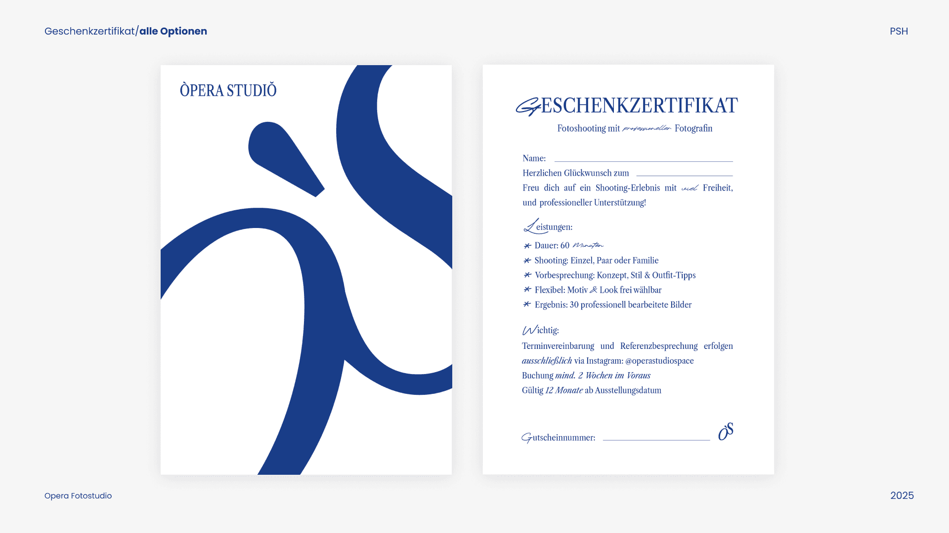 For Opera Studio, a contemporary photo studio, I developed a complete brand identity from the ground up. The project included everything from logo design and business cards to storefront stickers, gift certificates, and social media visuals.Three distinct design concepts were presented, and one was chosen as the final direction. Based on it, I created a mini brand guide to ensure visual consistency across all platforms — including Instagram and a vape-related website that adopted the same identity style.The result is a cohesive and elegant visual system that reflects the studio’s creative spirit and professional aesthetic.