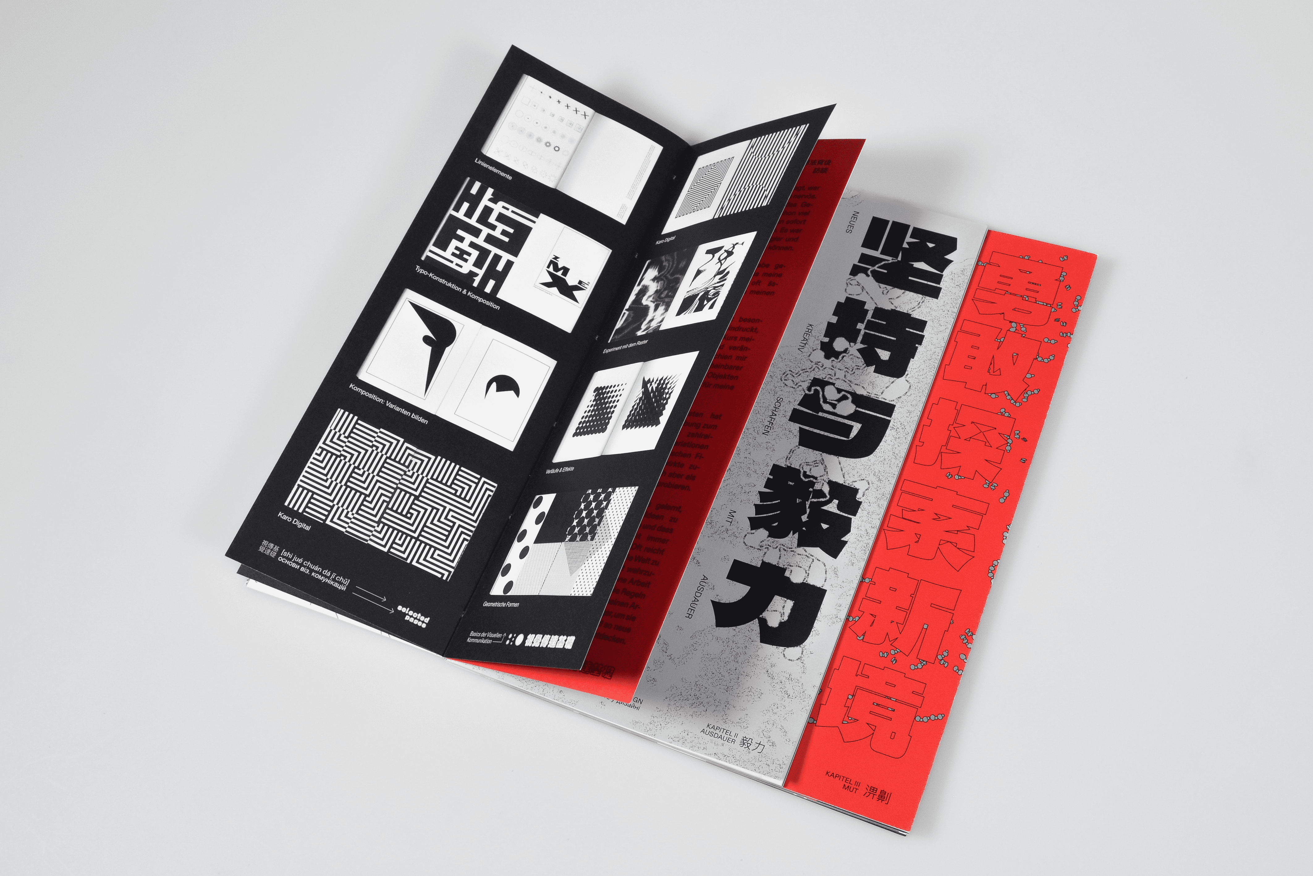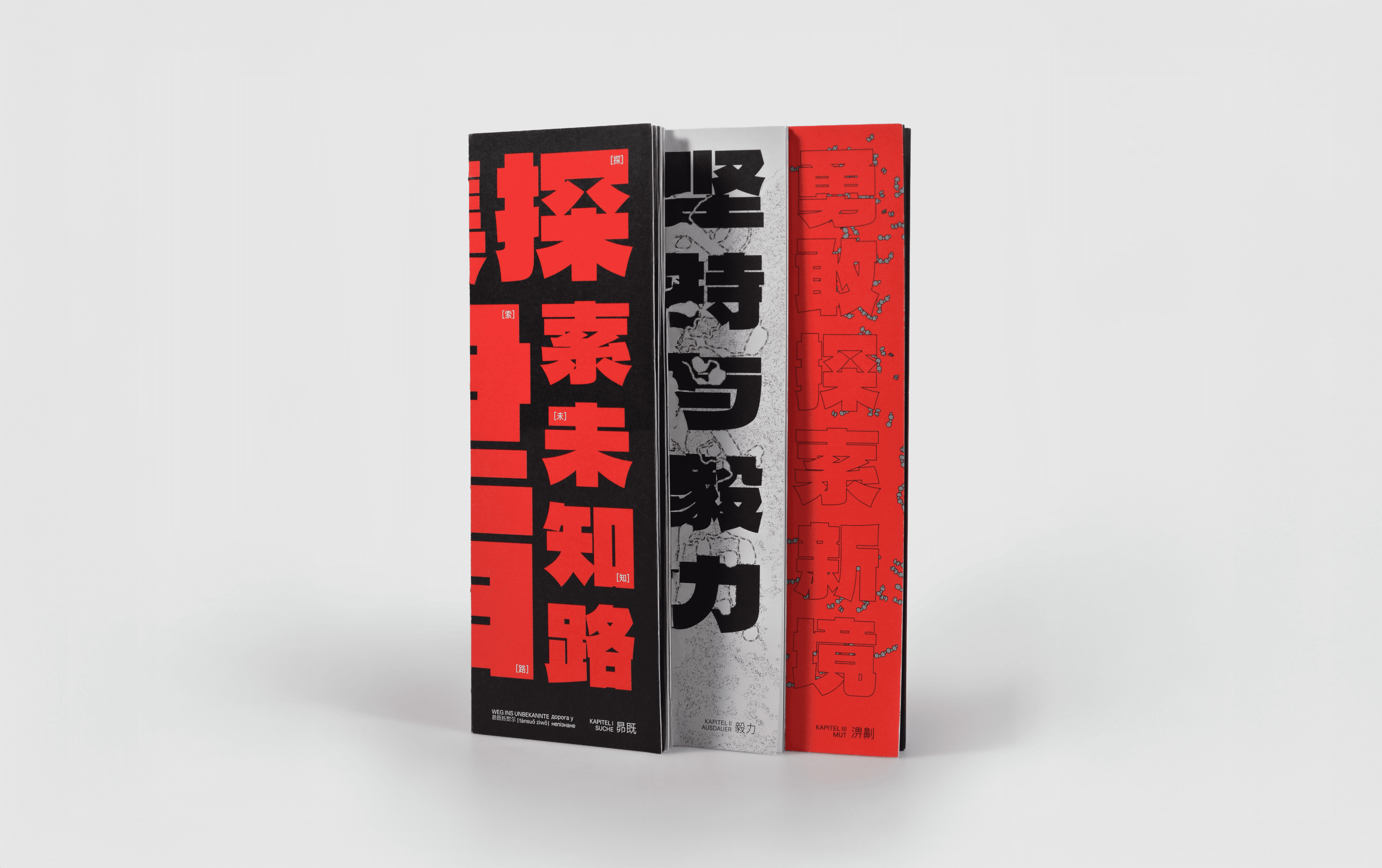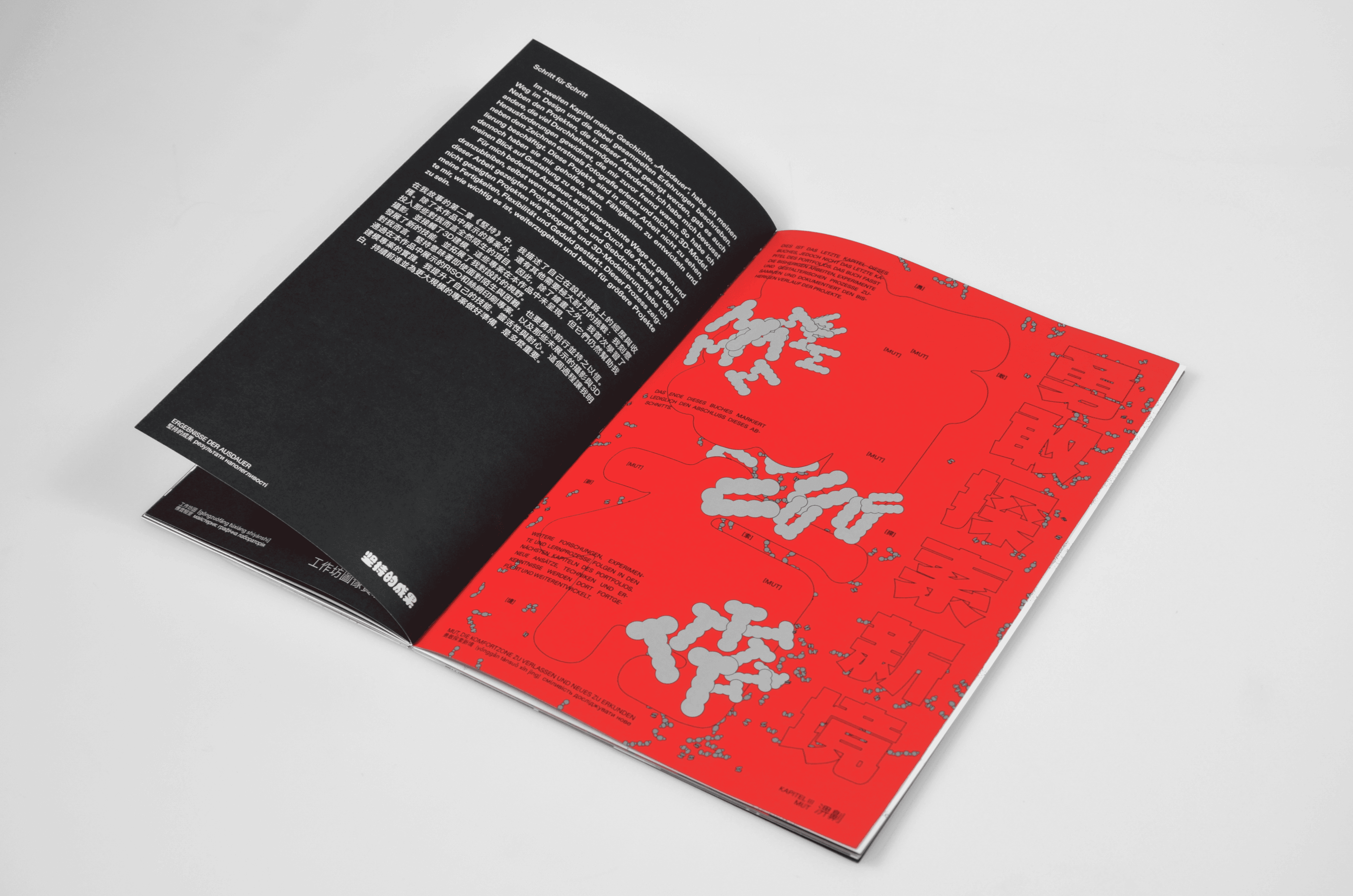 Between Transitions is an editorial book that documents personal creative growth through three phases: Search, Endurance, and Courage. The publication weaves three languages into a single design system, with Ukrainian as a quiet root layer, German as the structural foundation, and Chinese as a visual field for typographic experimentation. Each language forms its own layout layer, shaping rhythm, hierarchy, and meaning across the book. The result is a compact narrative where identity, transition, and design merge into one coherent publication.